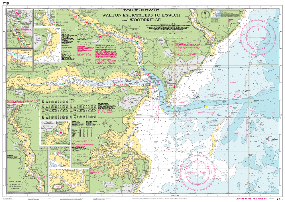 On this 2017 edition the latest available depth surveys have been applied. The chart specification has been improved to show coloured light flashes. There has been general updating throughout.