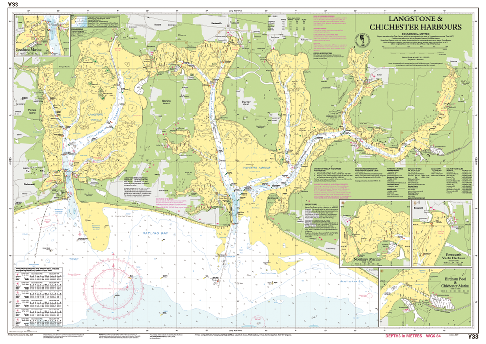 A large scale chart covering this popular area off the Solent, including Langstone and Chichester Harbours, Hayling Island and yacht harbours and marinas.